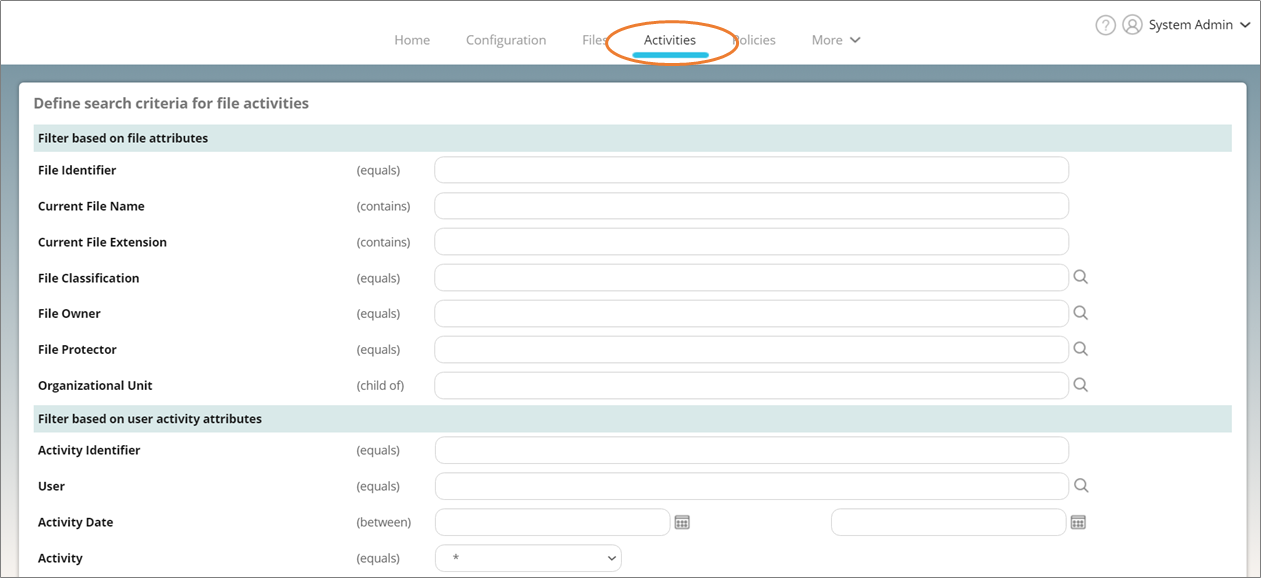As a System Administrator, you have the ability to search for activities performed on all protected files by all users. You also have access to additional search criteria not available to other users.